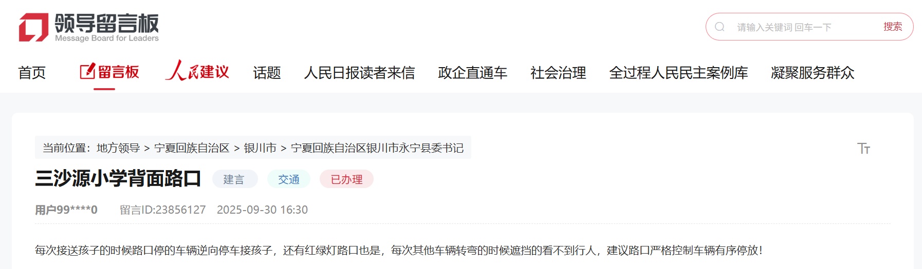 人民日报银川10月29日电(李甜甜)近日,有网友在人民日报网上“领导公告栏”留言反映,宁夏回族自治区银川市永宁县三沙园学校门口存在乱停车、车辆逆向行驶的情况。建议加强管控,实现车辆有序规范停放。互联网用户留言的屏幕截图。接到此消息后,永宁县公安局公开回应。回应称,永宁县对网友举报的路段在不同时间进行了多次现场检查和走访。调查发现,部分家长在上下学高峰时段,将车辆随意停放在双排停车场。另一方面,一些驾驶员道路安全意识淡薄,可能会逆行行驶、右转不行驶。屈服,或长时间停留在走走停停的区域。官方回应截图。针对上述情况,永宁县公安局坚决坚持“缓解拥堵与综合治理相结合”。当地公安部门在上学期间派出护士,劝说司机规范停车、停车和起步。每周五下午放学后我们还安排交警人员进行救援工作。同时,向学校师生和家长宣传文明停车、安全出行的理念,鼓励家长选择“绿色出行”或“异地停车、步行交通”。与此同时,永宁县公安局继续将校园周边交通秩序管理纳入日常工作核心,强化“护岗”等有效机制,加强与教育、学校等部门,奉行完善的“一校一策”管理方案。